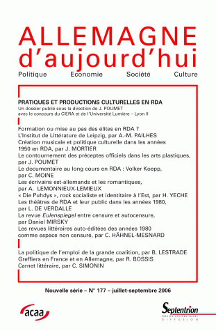 Dossier : Pratiques et productions culturelles en RDA Jacques poumet Formation ou mise au pas des élites en RDA ? L'exemple de l'Institut de Littérature de Leipzig A.M. Pailhès Création musicale et politique culturelle dans les années cinquante en RDA J. Mortier Le contournement des préceptes officiels dans les arts plastiques de RDA J. Poumet n cinéaste est-allemand en marge ? Volker Koepp au festival international de Leipzig C. Moine Les écrivains est-allemands et les romantiques A. Lemonnier-Lemieux Die Puhdys, rock socialiste et identitaire à l'Est H. Yeche Les théâtres de RDA et leur public dans les années 1980. Entre démocratisation et politisation de l'art théâtral L. de Verdalle La presse satirique de RDA à la fin des années 1980 : la revue Eulenspiegel entre censure et autocensure D. Mirsky Les revues littéraires auto-éditées en RDA dans les années 1980 comme espace non censuré C. Hähnel-Mesnard La politique de l'emploi de la grande coalition : priorité au secteur à bas salaires Brigitte Lestrade Greffiers en France et en Allemagne R. Bossis Comptes rendus Carnet littéraire de C. Simonin
